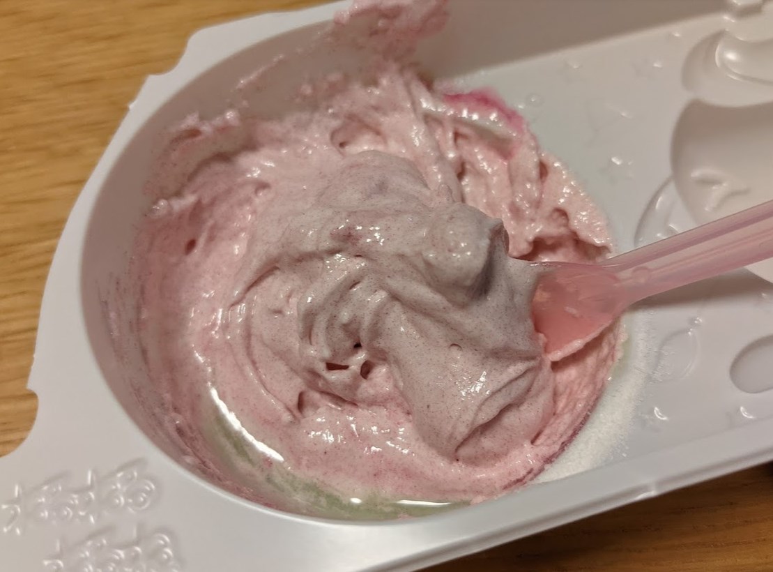 「寝ても覚めても少年マンガ」2021年5月2日の日記 日記 2021.05.03 ・奥底で忘れ去られていたねるねるねるねを作るぞ。 ・内容物。 ・粉1を容器に入れたら、付属のカップ1杯の水を入れ、よく練る。水に反応して泡立ち、粘性のある液体に変化していく。 ・まあこんなものだろう。 ・そして粉Bを入れてさらに混ぜていく。赤みが全体に馴染み、ふくらむまで根気よく混ぜる。 ・もう少し混ぜる。