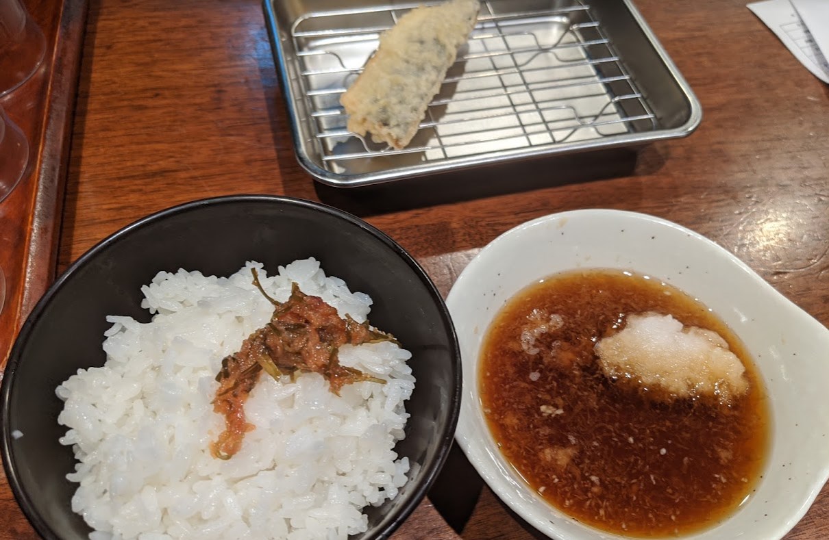 ・どっちも福岡でよく知られた天ぷらチェーン店だ。「ひらお」は塩辛が卓上に置いてあり、「たかお」は昆布明太が置いてあるんだって。