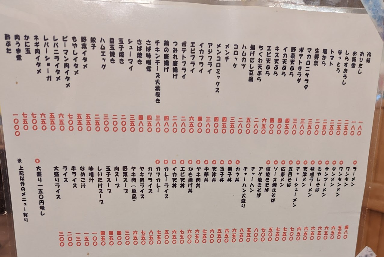 ・このメニュー表の完成度を見て欲しい。価格も安いし、メニューの幅広さもすごい。これを見ながら何を頼むか考えるだけでエンタメになってしまう。味もおいしかった。この店があるかないかで周辺のアパートの家賃が1000円変わると思う。
