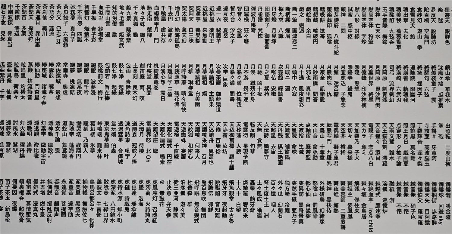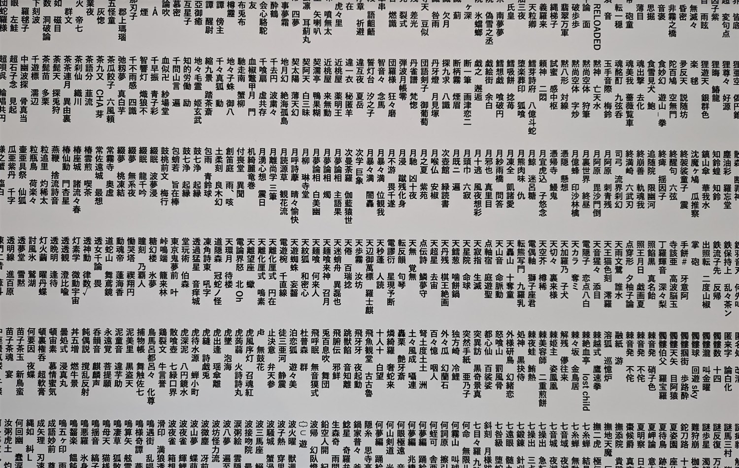 ・波ノ液薄々気配(なみのえき うすうすけはい)とか、鞭覇々(むちぱぱ)とか、いったいどうやって思いついたのか理解に苦しむ。「→力(このほうこうの ちから)」や「全熊(TOTAL BEAR)」に至っては笑いを超えて少し感動すら覚える。文字を組み合わせて「名」に仕立てるという営為における、ひとつの臨界点がここにあると思う。おもしろの皮をかぶらないで正面から前衛をやっているプロに見せて話を聞いてみたい。たぶんこんなことやってる人他にいないだろうから。
