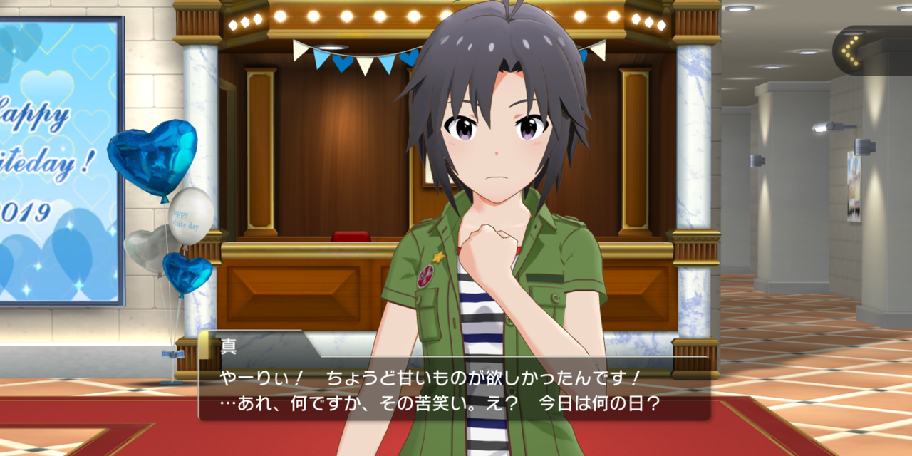 ・ホワイトデー仕様で菊地真さんが真ん中に来ていて、タイミングが不意打ちすぎて「うグッ」って言ってしまった。感情~~~。「担当キャラの新規絵が見れて嬉しい」という以上に、菊地さんが今なお「イケメン少女」という需要にまっすぐ応えている光景が目に痛い。そもそも菊地さんが「男の子にしか見えないイケメン少女」として人気があるのは作品世界の中の話だ。じつは本人は乙女チックな願望を秘めている、というところも含めた評価がメタ的な菊地真の魅力なので、こういうイラストは(現実の)ファンにとっては「う、ウオオ…」となってしまう、微妙にむず痒い、両手を挙げるわけにはいかない代物なのだ。でもいいよ……全部いい……もう全部いい……。全部肯定するわもう……。